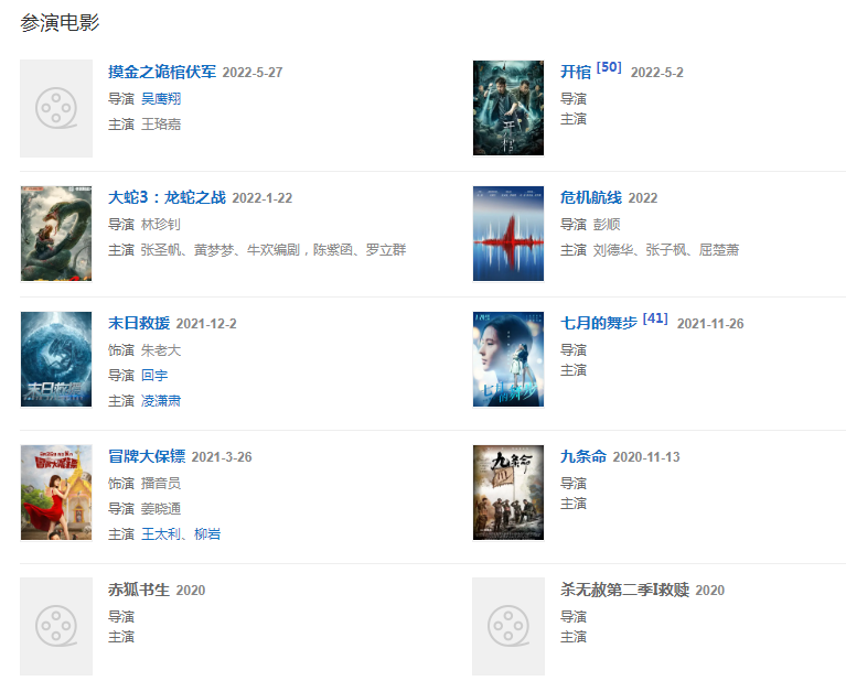 2022年1月22日,特邀出演的《大蛇3:龍蛇之戰(zhàn)》登錄優(yōu)酷全網(wǎng)獨(dú)播;2月7日,特邀出演的賀歲輕喜劇《假日暖洋洋2》在愛奇藝播出。2022年,參演驚悚大片《開棺》宣布定檔5月2日,于騰訊視頻、優(yōu)酷雙平臺(tái)全網(wǎng)首播。5月27日,特別出演的電影《摸金之詭棺伏軍》在騰訊視頻、愛奇藝雙平臺(tái)播出; 7月5日,參演電視劇《星漢燦爛》播出。