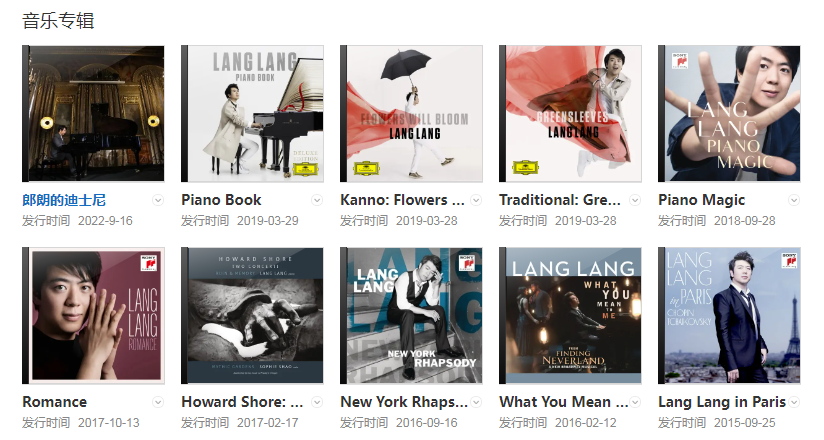 代表作品:郎朗在巴黎、紐約狂想曲、熱情奏鳴曲、夢幻飛琴、黃河之子、郎朗的歌:獻給2008、翻身的日子