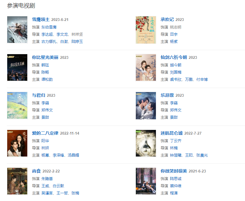 2022222日,與吳謹(jǐn)言合作主演的古裝美食電視劇《尚食》在芒果TV播出;413日,領(lǐng)銜主演了古裝雙強動作愛情劇《樂游原》;621日,領(lǐng)銜主演的古裝仙俠劇《仙劍六祈今朝》官宣男女主;727日,主演的民國劇《迷航昆侖墟》播出,在劇中飾演海外歸國學(xué)子丁云齊。