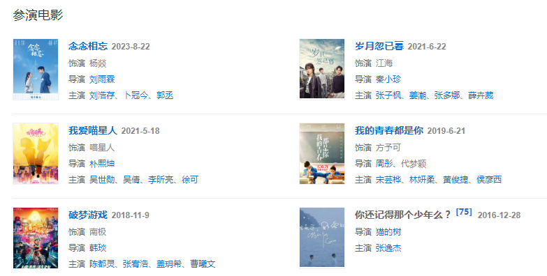 20164月,主演電影《歲月忽已暮》;同年,主演電影《破夢(mèng)游戲》 和《我的青春都是你》 。