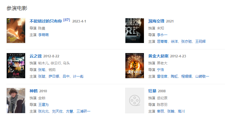 代表作品歡樂頌、生死線、刀客家族的女人、神犬奇兵、歸還世界給你、大江大河、我們都要好好的、愛在左,情在右