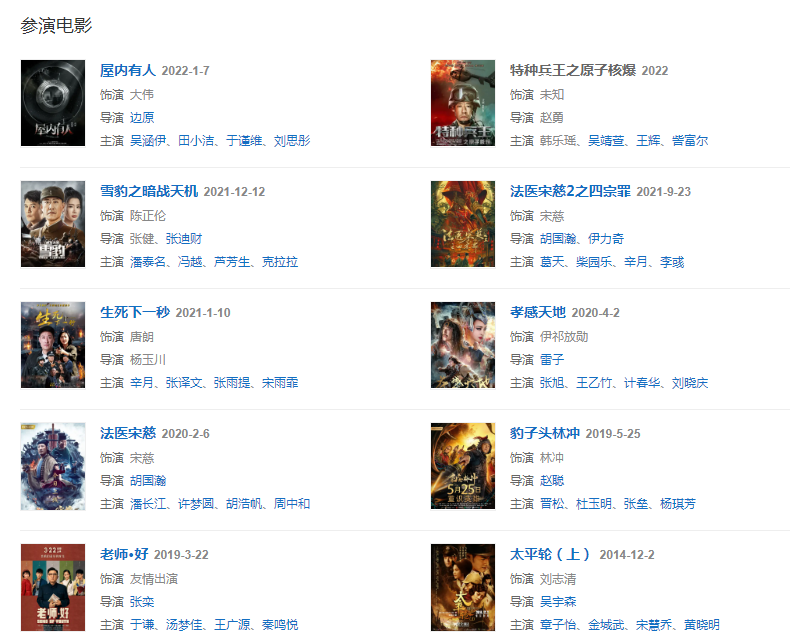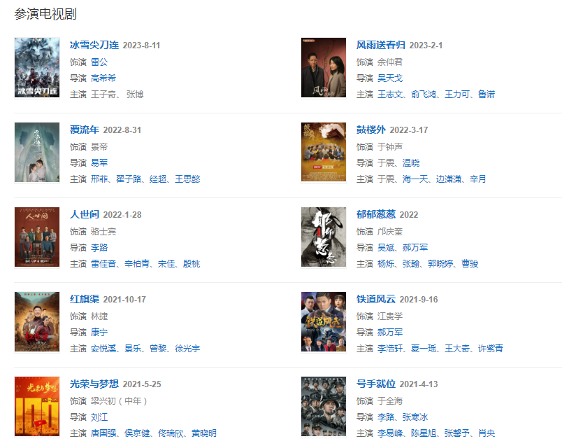 2021110日,主演的緝毒電影《生死下一秒》上映。413日,主演的火箭軍題材電視劇《號(hào)手就位》播出。
