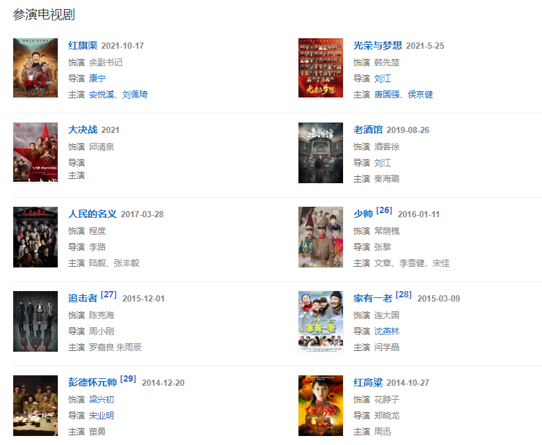 代表作品:人民的名義、紅高粱、孤軍英雄、大營救、兵變1938、八路軍