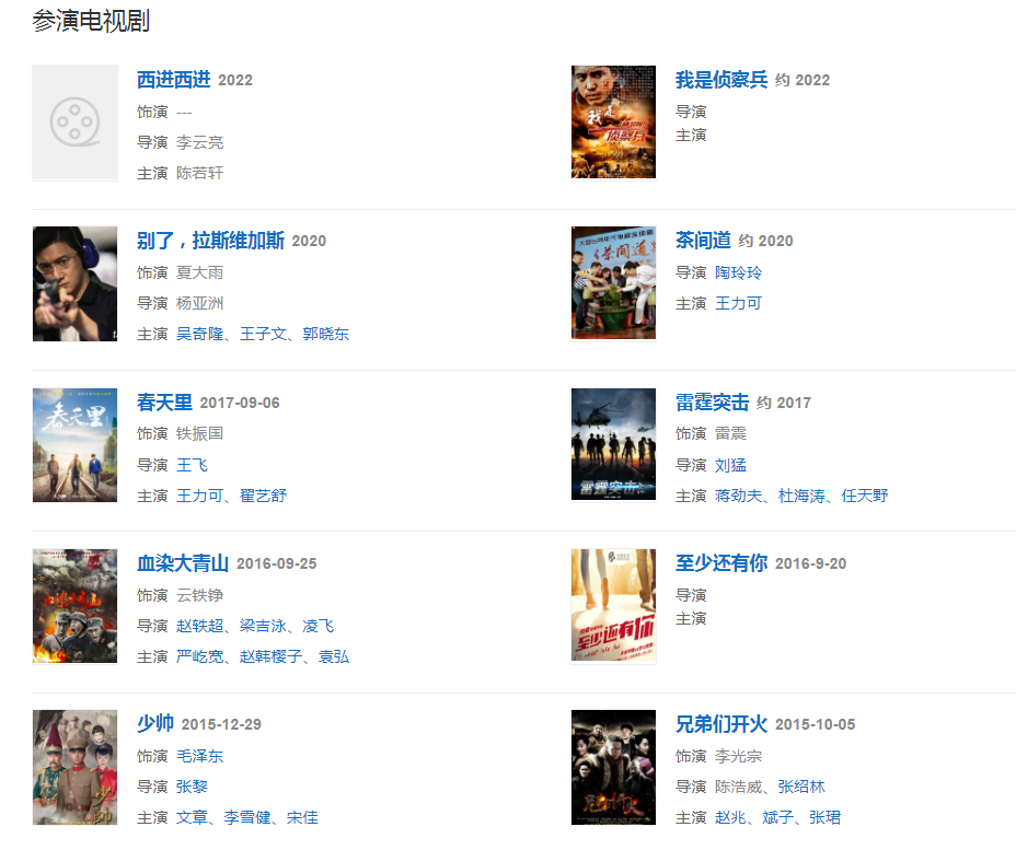 代表作品:中國1921、喋血1941、恰同學(xué)少年、我是特種兵、武工隊(duì)傳奇、兵出潼關(guān)、戰(zhàn)火西北狼