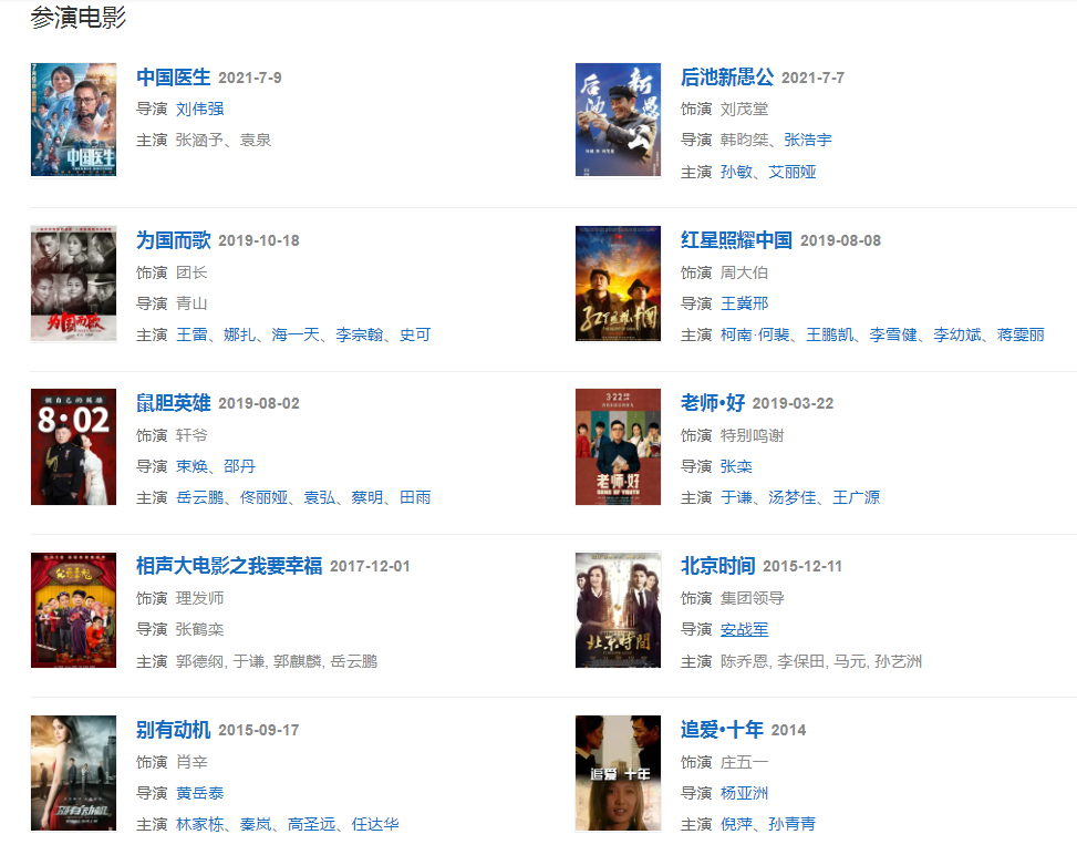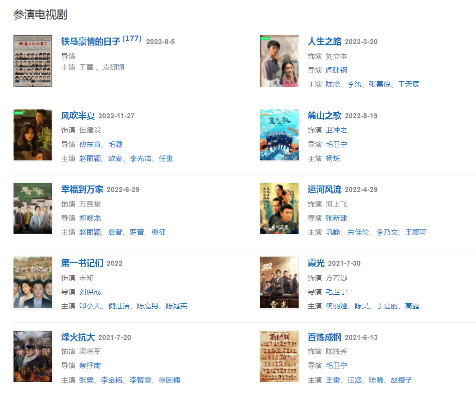 2021 218日,參演的都市情感劇《甜蜜》播出  33日,家庭生活輕喜劇《生活萬(wàn)歲》開(kāi)播;613日,參演電視劇《百煉成鋼》;71日,參加的慶祝中國(guó)共產(chǎn)黨成立100周年文藝演出《偉大征程》播出,與吳剛、歐豪、李易峰、郭曉冬合作表演《激情歲月》;79日,參演《中國(guó)醫(yī)生》播出; 720日,參演的電視劇《烽火抗大》播出; 101日,參演的話劇《直播開(kāi)國(guó)大典》在國(guó)家大劇院戲劇場(chǎng)首演,他在劇中飾演老夏;108日,主演的近代革命劇《霞光》在央視八套播出;參演電視劇《理想照耀中國(guó)》。
