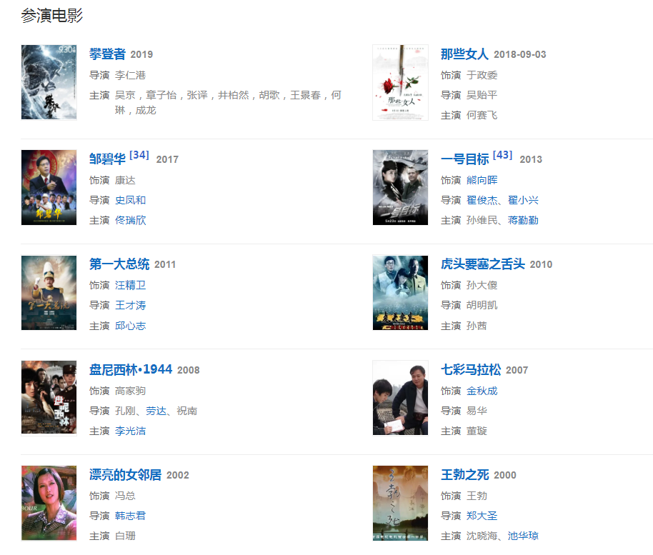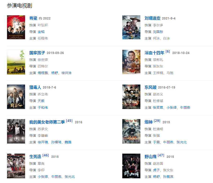 代表作品:英雄虎膽、炮神、大院子女、重慶諜戰(zhàn)、利劍、紅色電波、藍(lán)色檔案、相伴、神秘人質(zhì)、二十四道拐