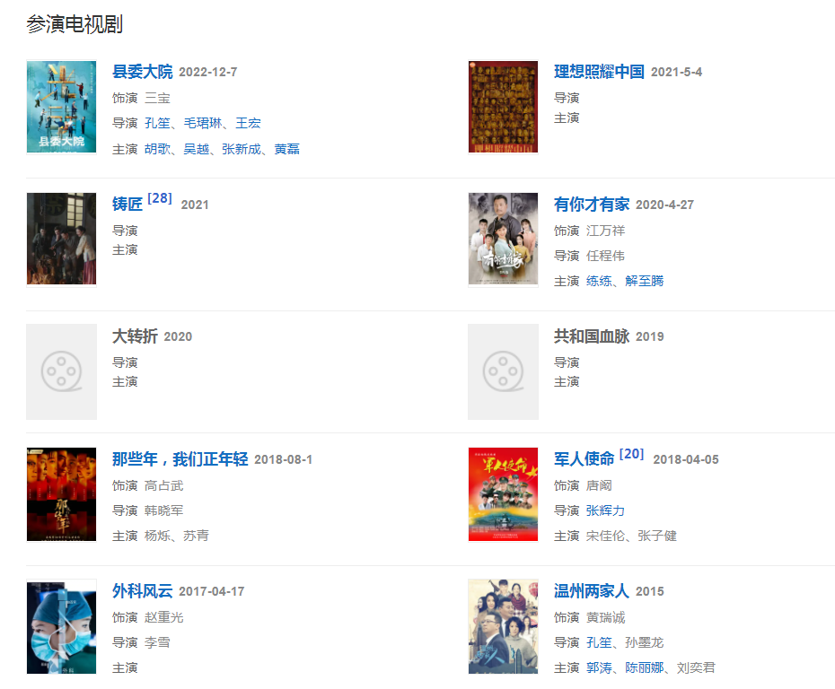 代表作品:大雪無痕、沙家浜、破冰、楚漢爭雄、曹老板的十八個(gè)秘書、戰(zhàn)長沙、有你才有家