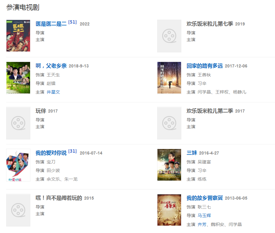 代表作品:當(dāng)家的女人、你攤上事兒了、吉祥三保、我的故鄉(xiāng)晉察冀、大宋提刑官2、我和丈母娘的十年戰(zhàn)爭(zhēng)