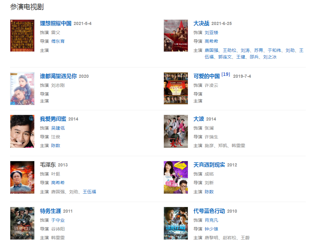 2021年參演電視劇《大決戰(zhàn)》,飾演劉亞樓。8月,主演電視劇《一剪芳華》播出,在劇中飾演張進(jìn)山  ;9月,主演電視劇《功勛》播出,在《孫家棟的天路》單元中飾演陳潛。