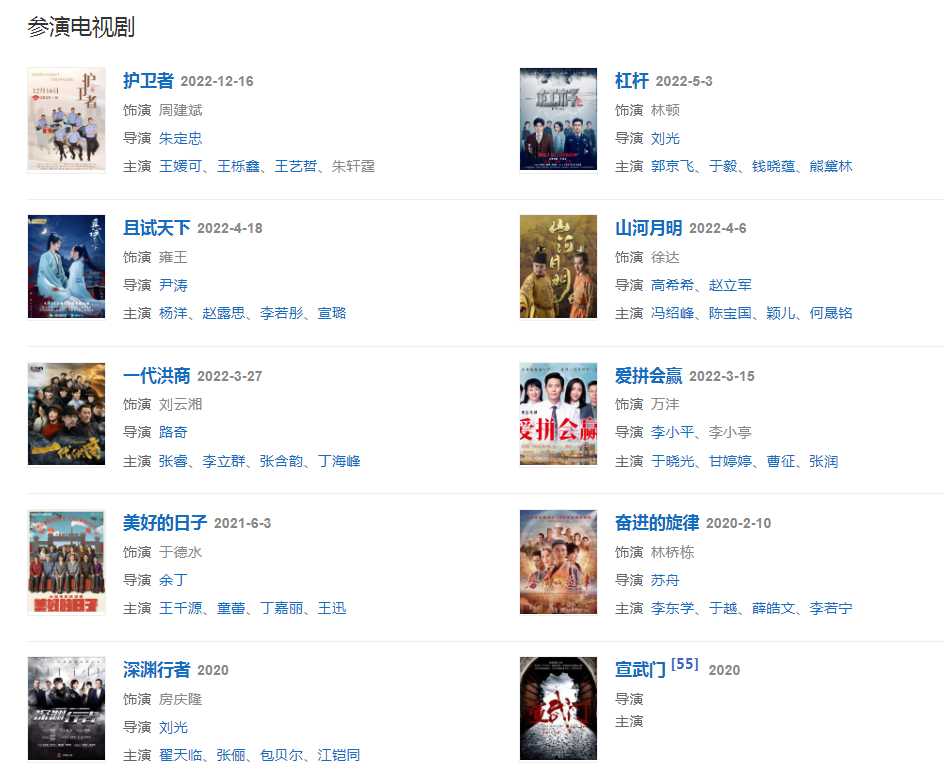 2022年,主演的近代歷史傳奇劇《一代洪商》在央視電視劇頻道播出。46日,友情主演的古裝歷史劇《山河月明》播出,在劇中飾演元帥徐達(dá);418日,參演的古裝言情劇《且試天下》播出,在劇中飾演豐蘭息的父親雍王;53日,主演的經(jīng)偵商戰(zhàn)劇《杠桿》在江蘇衛(wèi)視播出。