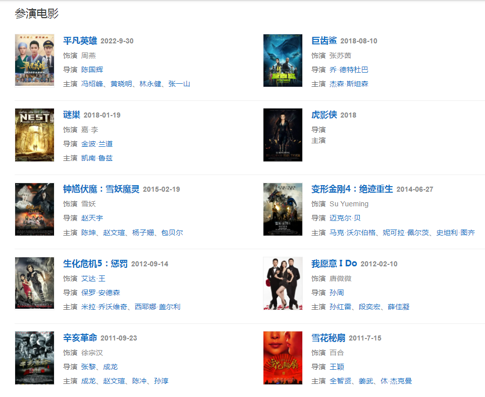 代表作品:風(fēng)聲、云水謠、過年回家、獨(dú)自等待、生化危機(jī)5:懲罰、雪花與秘扇、狄仁杰之通天帝國、巨齒鯊