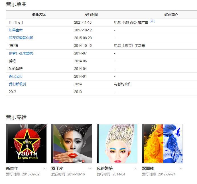 代表作品:放過、雙面體、雙子座、我的翅膀、20歲、你拿什么來愛我、眼睛到地面的距離、我深深愛著你啊