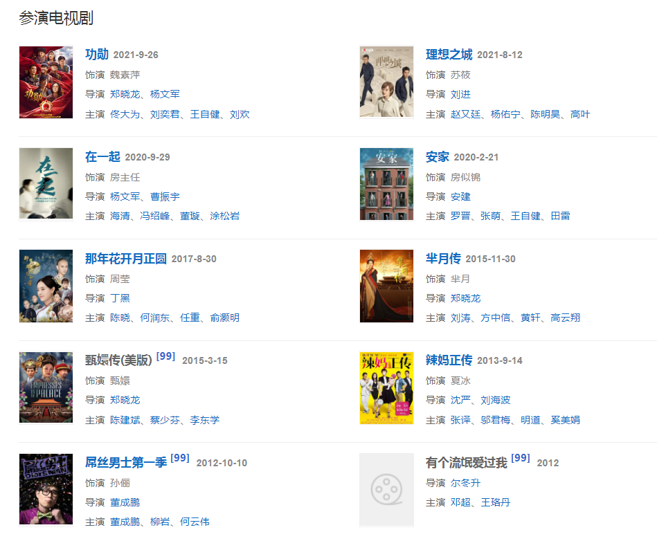 代表作品:甄嬛傳、玉觀音、幸福像花兒一樣、那年花開月正圓、羋月傳、新上海灘、辣媽正傳、血色浪漫、畫皮、影、霍元甲、愛如空氣、小小的夢想、安家、理想之城、小姨多鶴、一米陽光