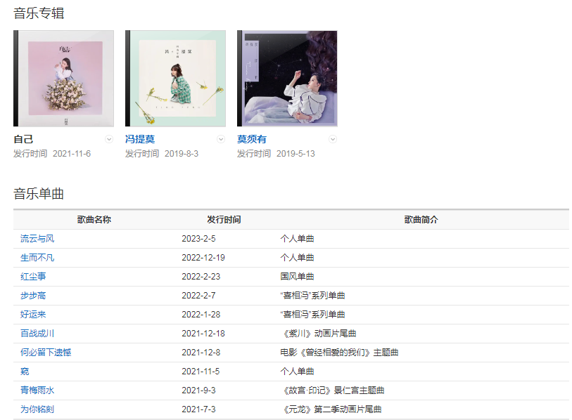 2019年1月,獲得第一屆Q China 2018年度音樂盛典最佳社交媒體音樂人獎;5月,發(fā)布個人翻唱專輯《莫須有》;8月,舉辦首場個人演唱會,并發(fā)布首張原唱實體專輯《馮提莫》。