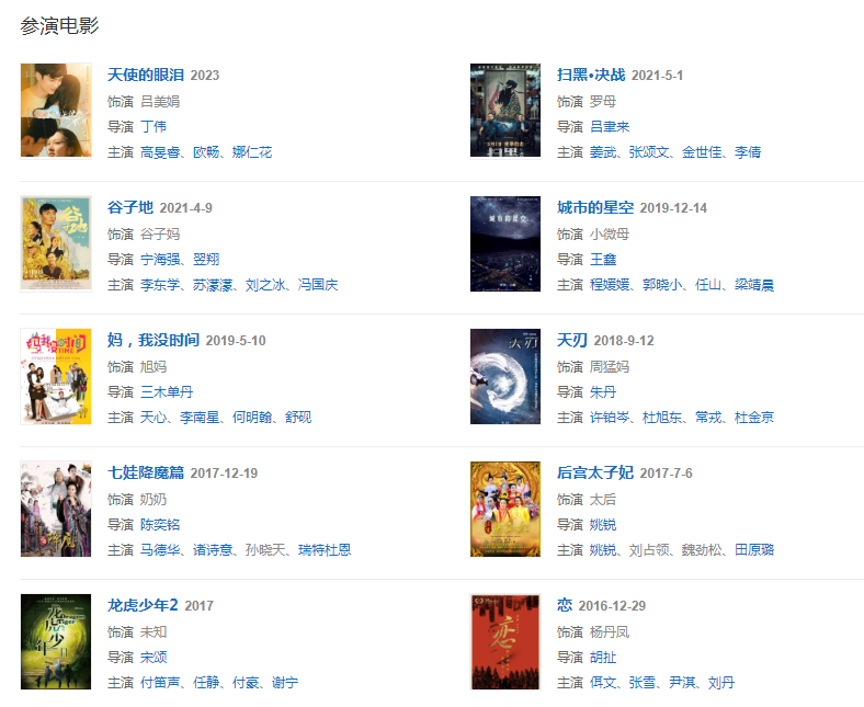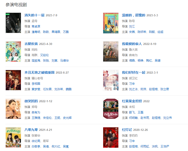 代表作品:《過年》、《幸福像花兒一樣》、《岳母的幸福生活》、非親姐妹