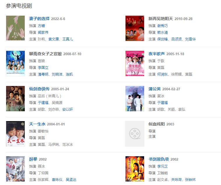 代表作品仙劍奇?zhèn)b傳、聊齋奇女子、新再見艷陽天、天地傳說之魚美人