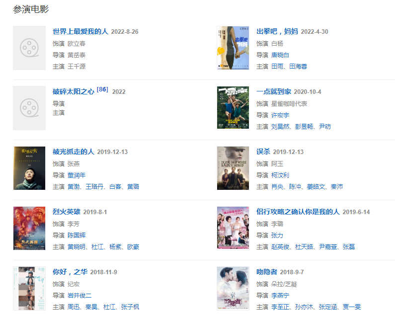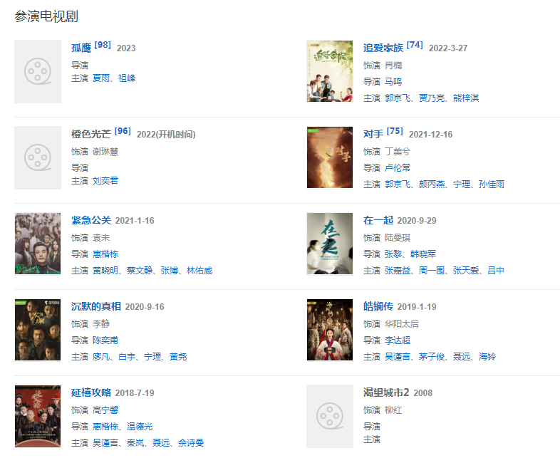 代表作品:延禧攻略、皓鑭傳、春風(fēng)沉醉的夜晚、我不是藥神、HELLO!樹先生、暴裂無聲、追兇者也