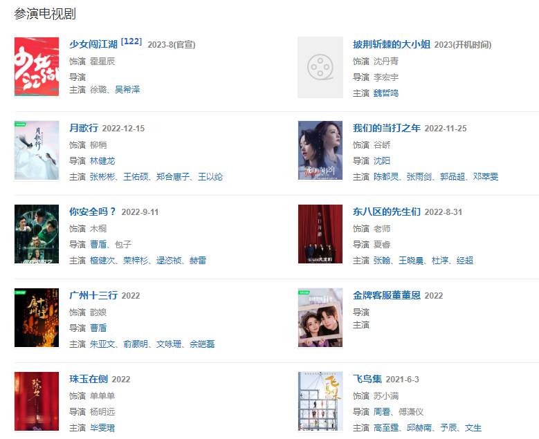 代表作品閃光少女、甄嬛傳、海上牧云記、高興遇見你、天衣無(wú)縫、長(zhǎng)安十二時(shí)辰、愛上北斗星男友、良辰美景好時(shí)光、若你安好便是晴天、風(fēng)聲