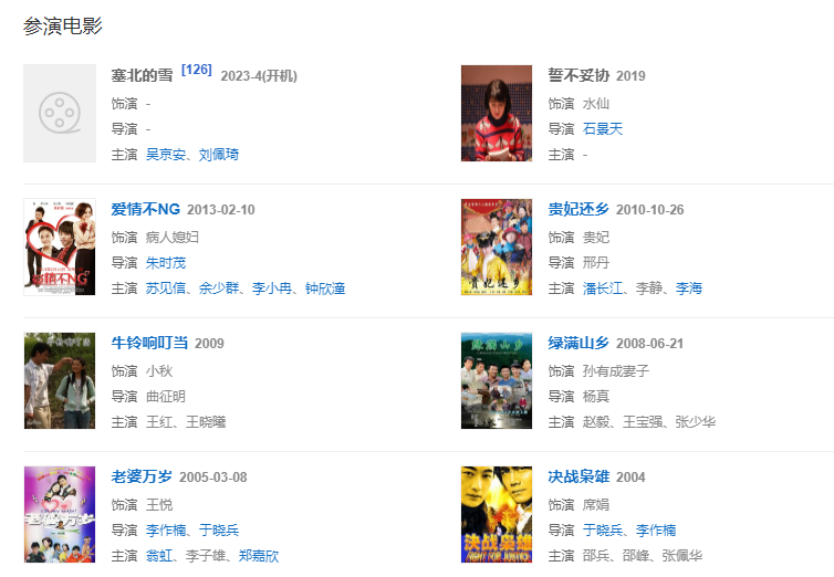2001年,因成功出演電視劇《劉老根》中的“山杏”而被觀眾所熟知。