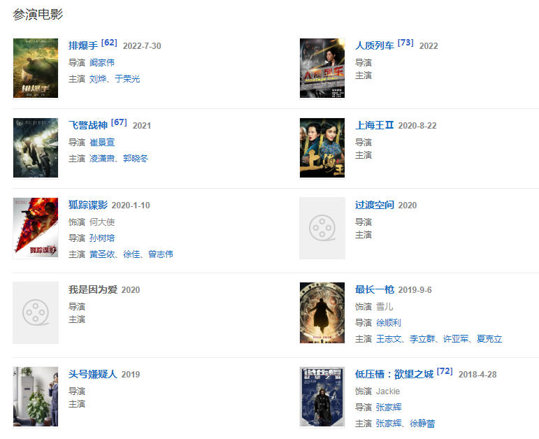 代表作品月蝕、驚蟄、左右、殺生、戰(zhàn)狼、敢死隊2、全民目擊、無人區(qū)、圖雅的婚事、智取威虎山、戰(zhàn)狼Ⅱ
