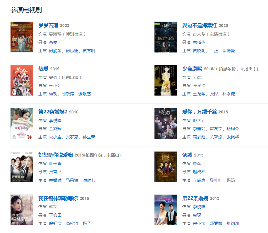2023年特別出演的古裝宮廷劇《歲歲青蓮》,她在劇中飾演慕?,帲蔷嚯x出道首部電視劇《紅蘋果樂園》18年后再次出演反派角色 。