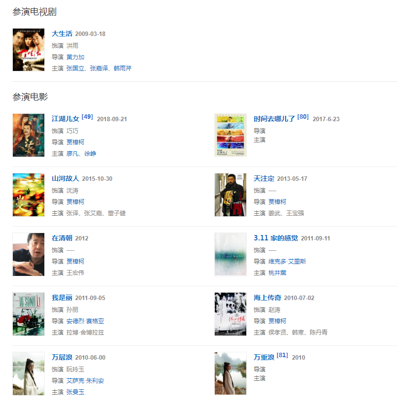 代表作品:站臺、我是麗、三峽好人、萬層浪、二十四城記、山河故人、天注定、海上傳奇、大生活