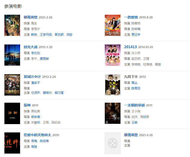 代表作品:愛情公寓3、利箭行動、歷史永遠銘記、隋唐演義
