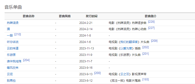 2024年1月1日,參加《揚(yáng)帆遠(yuǎn)航大灣區(qū)——2024新年音樂會(huì)》,與炎明熹一起演唱歌曲《刀劍如夢(mèng)》《江湖笑》; 1月6日,演唱電視劇《我們的翻譯官》片頭曲《聽你訴說》;1月8日,發(fā)布單曲《一眼》; 1月,參加《2023微博之夜》,并和伯遠(yuǎn),劉宇,米卡,許佳琪一起表演《第一天》; 1月25日,參加《2024山東春節(jié)聯(lián)歡晚會(huì)》;1月27日,參加《航天之夜》;2月2日,參與演出的《中央廣播電視總臺(tái)2024網(wǎng)絡(luò)春晚》在愛奇藝播出,演唱歌曲《365個(gè)祝福》;2月3日,參與演出的《同心向未來——2024中國網(wǎng)絡(luò)視聽年度盛典》播出,并表演節(jié)目《沙與?!?。2月4日,參加2024年央視特別節(jié)目《新春非遺之夜》,與黃齡演唱歌曲《國色》。2月5日,參加央視節(jié)目《“經(jīng)典之夜”年度盛典》,演唱歌曲《絨花》 ;2月7日,參加《2024山東春節(jié)聯(lián)歡晚會(huì)》,表演歌曲《父親寫的散文詩》《龍的傳人》;2月9日,參加《龍騰虎躍·中國年味》,演唱歌曲《人間好時(shí)節(jié)》 ;同日,參加《2024年中央廣播電視總臺(tái)春節(jié)聯(lián)歡晚會(huì)》,合作表演節(jié)目《流行勁曲串燒》;2月10日,參加《2024年江蘇衛(wèi)視春節(jié)聯(lián)歡晚會(huì)》;同日,參加《百花迎春——中國文學(xué)藝術(shù)界2024春節(jié)大聯(lián)歡》,表演節(jié)目《驍》 ;2月24日,加盟《2024江蘇衛(wèi)視元宵晚會(huì)》,演唱歌曲《別為難星星》。