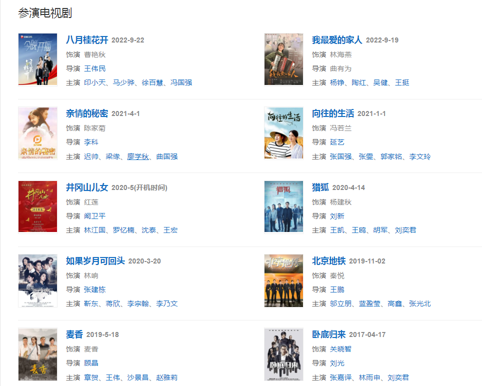 20195月主演的軍屬勵(lì)志大劇《麥香》播出;11月,主演的當(dāng)代都市劇《北京地鐵》播出。