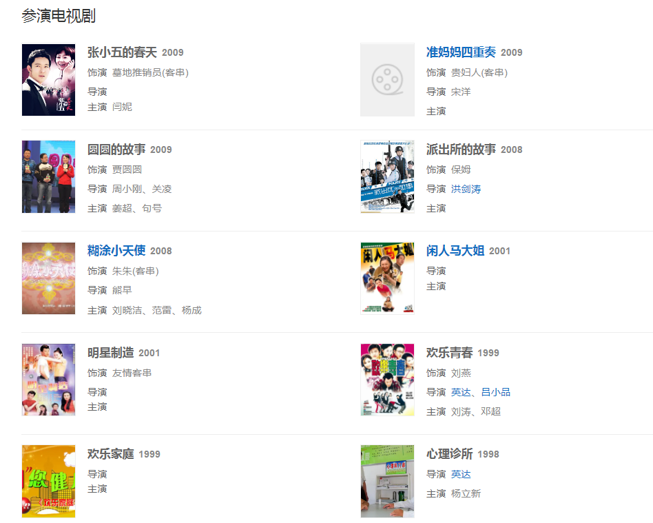 1993年,在中國第一部情景喜劇《我愛我家》中飾演賈圓圓而走紅,之后客串多部情景劇《閑人馬大姐》《明星制造》《中國餐館》《心理診所》《歡樂家庭》。