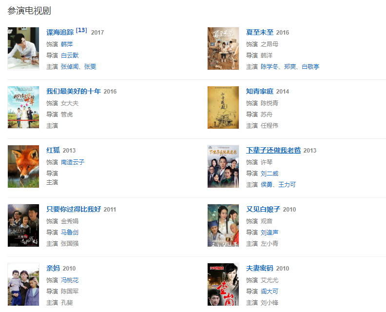 2016年,與任程偉主演反映知青家庭生活、富二代教育題材的電視劇《知青家庭》  。