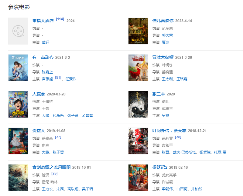 代表作品:少帥、受益人、煎餅俠、兩個女人的戰(zhàn)爭、大鬧天竺、大贏家、從你的全世界路過