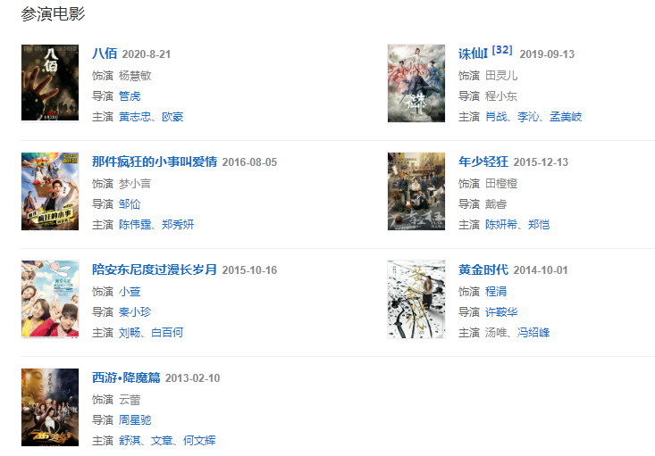 2013年,參演古裝傳奇動作劇《隋唐演義》;同年,出演個人首部電影《西游·降魔篇》。2015年,參演都市愛情片《陪安東尼度過漫長歲月》,搭檔陳偉霆主演都市情感劇《因為愛情有幸福》。