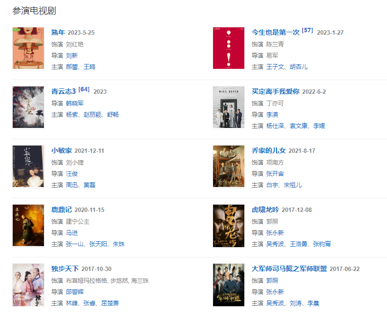 20221月,參加“百花迎春——中國文學藝術界春節(jié)大聯(lián)歡”錄制;22日,參加《百花迎春》晚會,演唱歌曲《生活總該迎著光亮》;62日,其主演的時尚行業(yè)劇《買定離手我愛你》播出,在劇中飾演為自己所熱愛的事業(yè)前進不止的丁亦可。