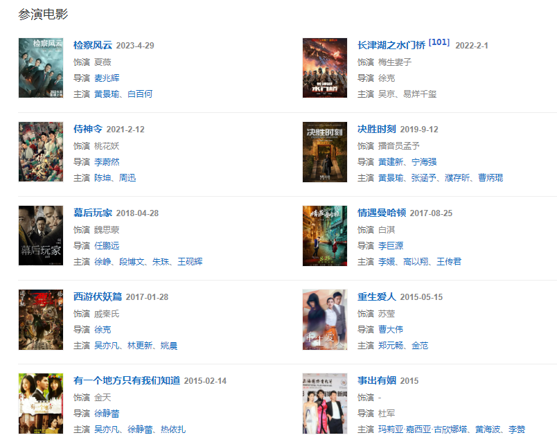 代表作品:五號(hào)特工組、五號(hào)特工組2、封神演義、美人心計(jì)、北京青年、青盲、漂洋過海來看你、兩生花、海洋之城、光榮與夢(mèng)想