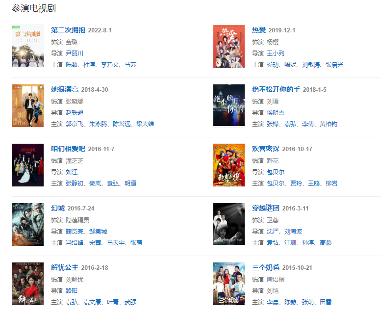 2014年憑借年代劇《大河兒女》獲得國劇盛典年度觀眾最喜愛劇中角色女演員獎  201611月,主演的都市情感劇《咱們相愛吧》播出。