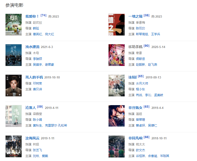 201943日,特別出演的古裝神話(huà)劇《新白娘子傳奇》在愛(ài)奇藝播出,在劇中飾演許仙的母親。44日,出演電影《非分熟女》。