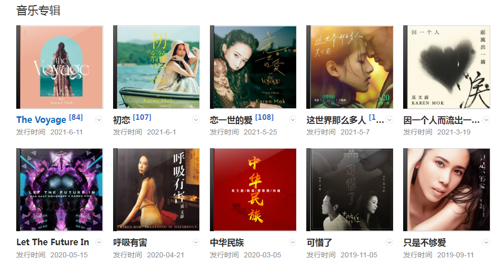 代表作品:忽然之間、他不愛我、如果沒有你、盛夏的果實(shí)、電臺(tái)情歌、愛、陰天、寂寞的戀人啊、慢慢喜歡你、沒時(shí)間、寶貝、境外、頭號(hào)粉絲、愛情、呼吸有害、這世界那么多人、大話西游、喜劇之王、食神、墮落天使