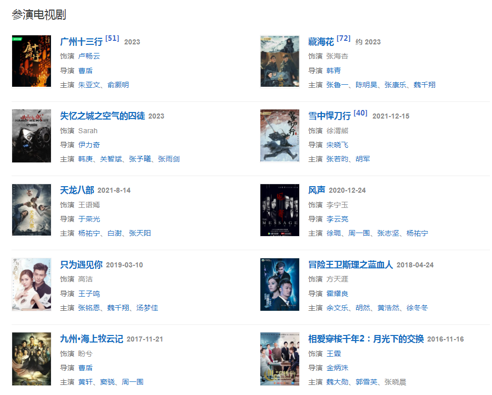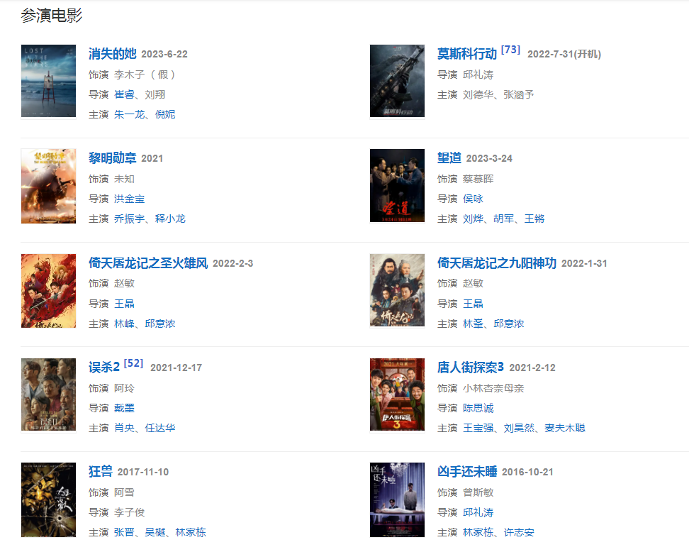 2023324日,領(lǐng)銜主演的電影《望道》上映,在片中飾演了《共產(chǎn)黨宣言》第一個中文全譯本翻譯者陳望道先生的妻子蔡慕暉;622日,領(lǐng)銜主演的懸疑犯罪電影《消失的她》全國上映,在片中飾演假妻李木子。