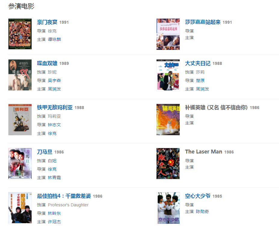 1986年,憑借電影《刀馬旦》獲得第6屆香港電影金像獎最佳女主角提名。