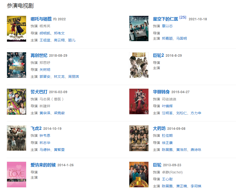 代表作品:溏心風(fēng)暴、護(hù)花危情、金石良緣、隨時(shí)候命、十分愛、大藥坊、再創(chuàng)世紀(jì)、發(fā)誓、其實(shí)我不快樂