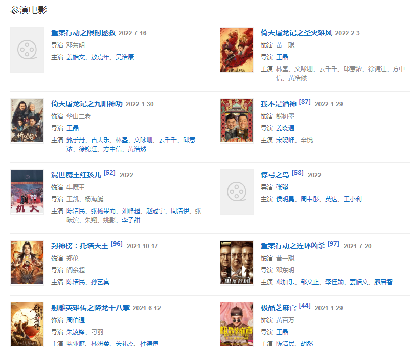 2022129日,與宋曉峰、辛悅領(lǐng)銜主演的喜劇電影《我不是酒神》在優(yōu)酷、愛奇藝視頻同步上映; 參演電影《倚天屠龍記之圣火雄風》。參演電影《倚天屠龍記之九陽神功》。