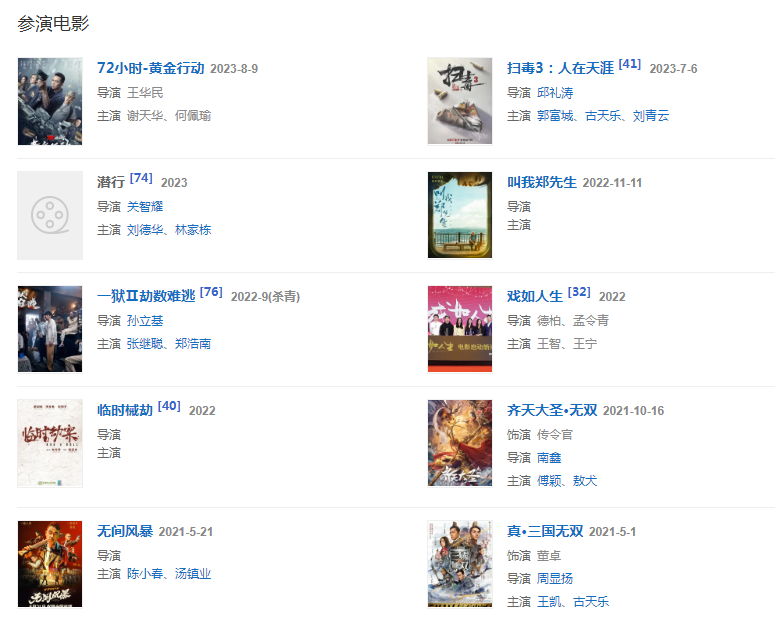 2021年3月18日,主演的奇幻親情喜劇電影《窈窕老爹》在愛奇藝獨家播出 。4月29日參與主演的電影《真·三國無雙》在中國香港上映、5月1日在中國大陸上映;5月,與陳小春、湯鎮(zhèn)業(yè)合力參演港式警匪片《無間風暴》。10月16日,參演的網(wǎng)絡電影《齊天大圣·無雙》正式在騰訊視頻全網(wǎng)獨播。