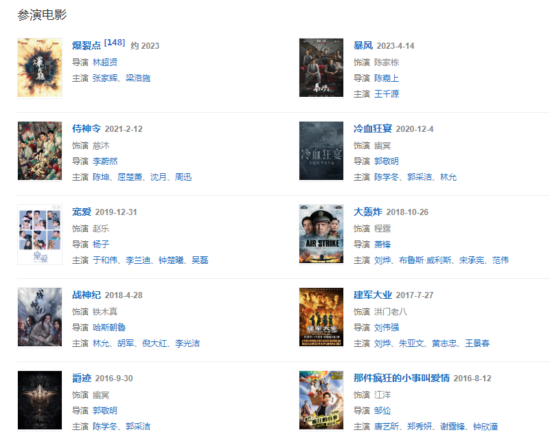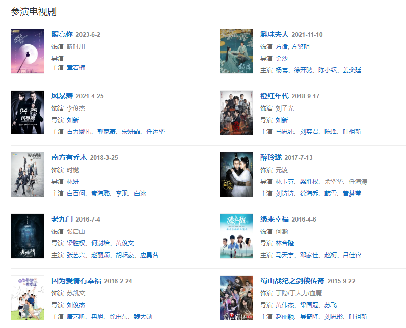 代表作品:前度、古劍奇譚、活色生香、蜀山戰(zhàn)紀之劍俠傳奇、老九門、醉玲瓏、戰(zhàn)神紀、南方有喬木、橙紅年代、有借有還、好想抱著你、Love U2、女皇、我門
