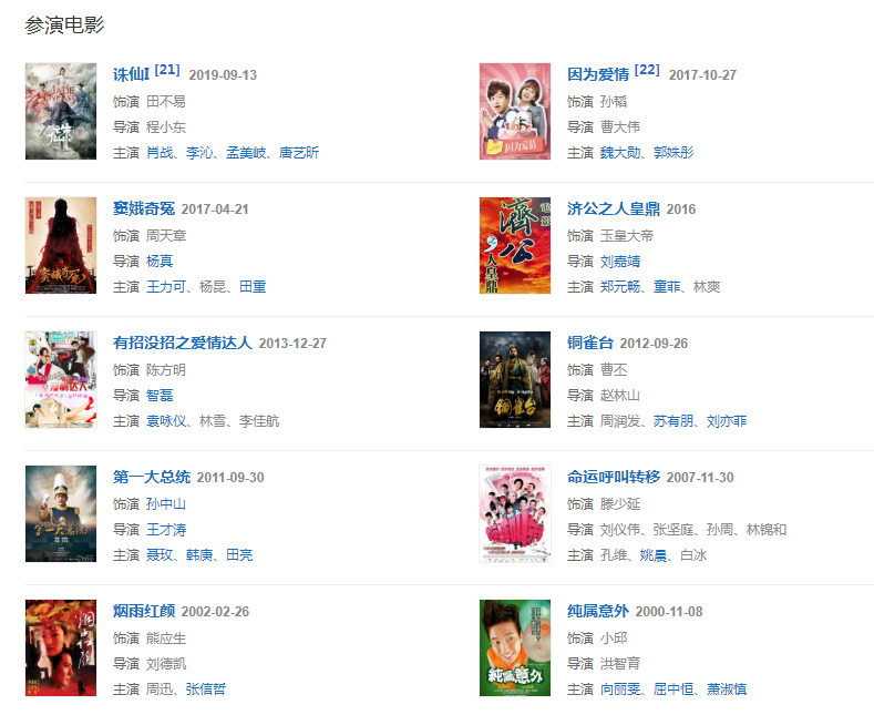 代表作品:第一大總統(tǒng)、雪中悍刀行、梧桐雨、傻阿甘、聊齋之花姑子