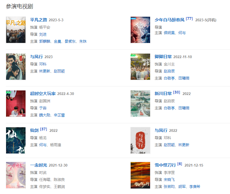 202125日,參演電視劇《斗羅大陸》播出;1215日,參演的古裝勵(lì)志劇《雪中悍刀行》播出,在劇中飾演李淳罡;1230日,參演的都市情感劇《一念時(shí)光》播出。