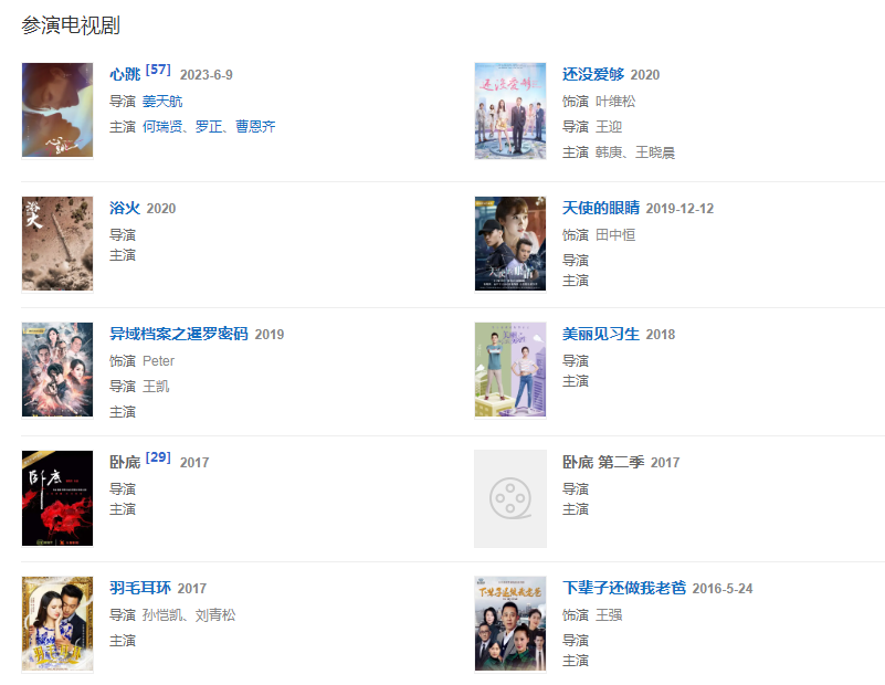 202015日,出演的都市情感劇《還沒愛夠》播出  922日,主演的電影《鐘馗降魔》在橫店開機。108日,主演的電影《大明烽火》在橫店開機,在片中飾演文官于謙。