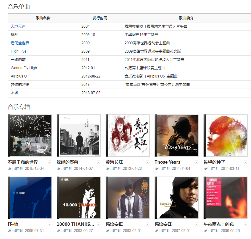 2006年5月26日以“高齡新人”身份推出個(gè)人同名首張專輯《楊培安——午夜兩點(diǎn)半的我》,憑借專輯中的《我相信》一曲打響知名度 。