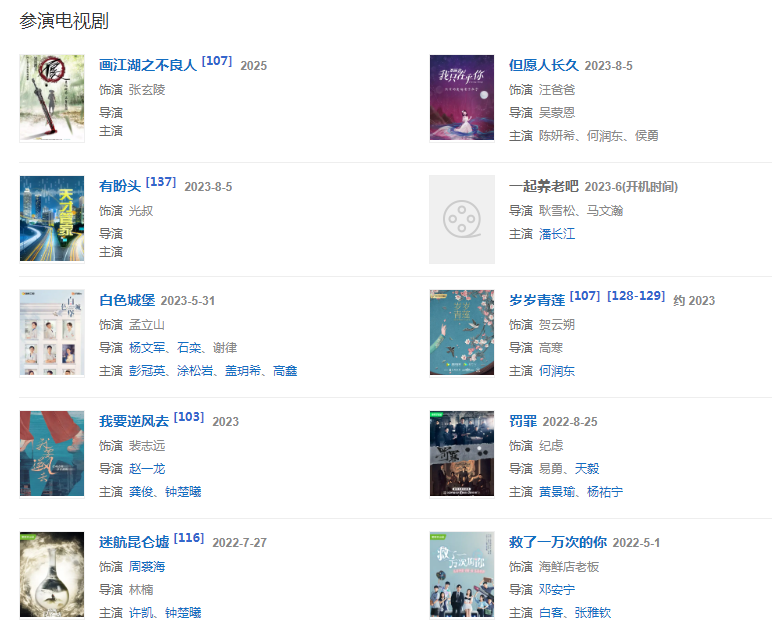 代表作品情義無價、京城四少、日正當中、明宮謎案、大當家、那年花開月正圓、西虹市首富、都挺好、辣媽正傳