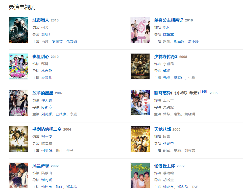 代表作品:十七歲的雨季、不是每個戀曲都有美好回憶、為什么受傷的總是我、戲夢、稻草人、對望、放羊的星星、絕代雙驕、天龍八部、天地傳說之寶蓮燈、笑林小子